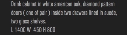 Drink cabinet in white american oak, diamond pattern doors ( one of pair ) inside two drawers lined in suede, two glass shelves.